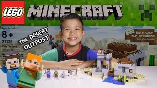 EvanTubeHD showcases the LEGO Minecraft Desert Outpost (21121) through an unboxing, review, and time-lapse build. The video highlights the set's 519 pieces, the five included minifigures (Steve, Alex, 2 Skeletons, and a wolf), and the explosive TNT action in the tall tower.