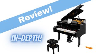 BlueBrick33's review highlights the LEGO Ideas Grand Piano's design, building techniques, and playability features using the LEGO Powered Up app. The unboxing video emphasizes the inclusion of Power Functions and its origin as a fan-designed project.