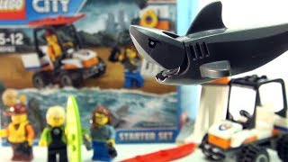 Join the crew of the LEGO® City coast guard as they protect the beach with the Coast Guard Starter Set, featuring a beach tower with stairs and viewing platform, beach buggy with opening roll cage, room for 2 minifigures and space for the 2-minifigure surfboard on the roof, binoculars, 2 walkie-talkies and a small surfboard. Includes 3 minifigures and a shark figure.