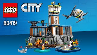 Top Brick Builder offers a step-by-step build of the LEGO City Police Prison Island (60419), specifying its 980 pieces and dimensions of over 14.5 inches high, noting its January 2024 release.