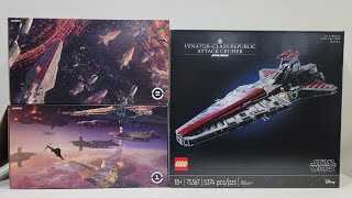 Beyond the Brick praises the Venator's faithful recreation of the Clone Wars ship, highlighting the printed 20th-anniversary brick and updated Captain Rex minifigure. BigZachsHouse shows the set's extensive contents, noting the dual boxes and numerous bags, anticipating a substantial building experience.