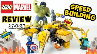 MyBrickTime's speed build and review emphasizes the LEGO Marvel Iron Man Hulkbuster vs. Thanos set's (76263) accessibility for young builders. The reviewer praises the posable Hulkbuster, Iron Man, and Thanos minifigures, and Thanos' aircraft with disc shooter.